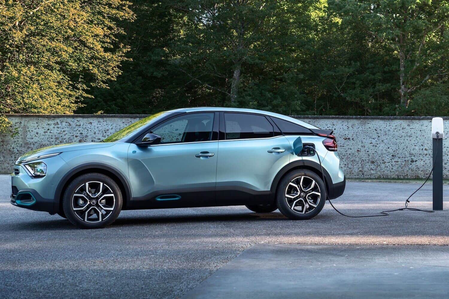 A Citröen ë-C4 (2020) Type 2-es csatlakozóval tölthető, és 7.4 kW-ot tud felvenni, így leggyorsabban 7 óra 15 perc alatt tölthető fel a teljesen lemerült akkumulátor, ami egy sima fali csatlakozóval 23 óra 30 percre nő.
